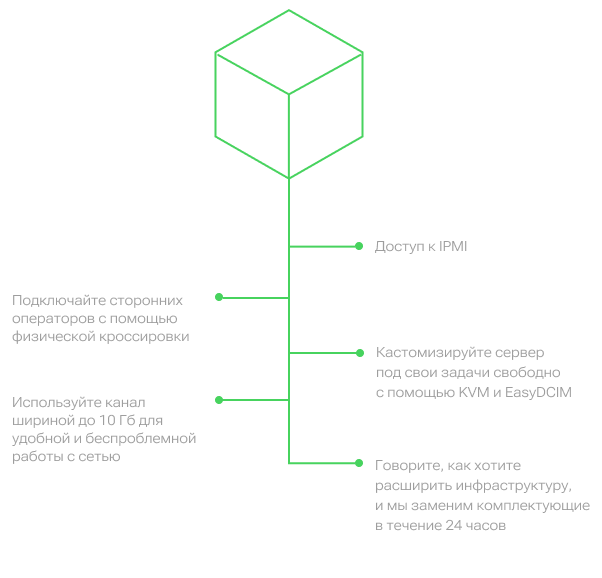 Надежный ЦОД Tier III с мощной инфраструктурой и высокоскоростным интернетом. Возможность подключиться к удаленному доступу через IPM/iLO/iDRAC.