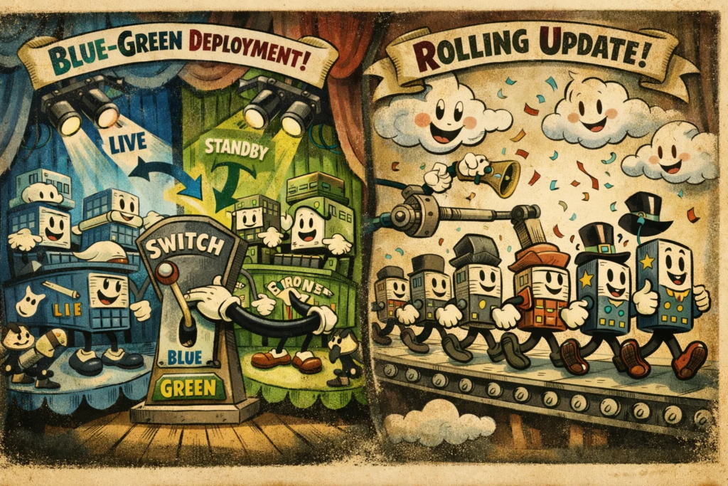 Именно поэтому стратегия деплоя так важна. Вопрос уже не в том, выложили ли новый билд, а в том, как сервис переживает смену версии под живой нагрузкой. На этом фоне и появляются Blue-Green Deployment и Rolling Update — два популярных подхода к обновлению серверной части без полного отключения системы.