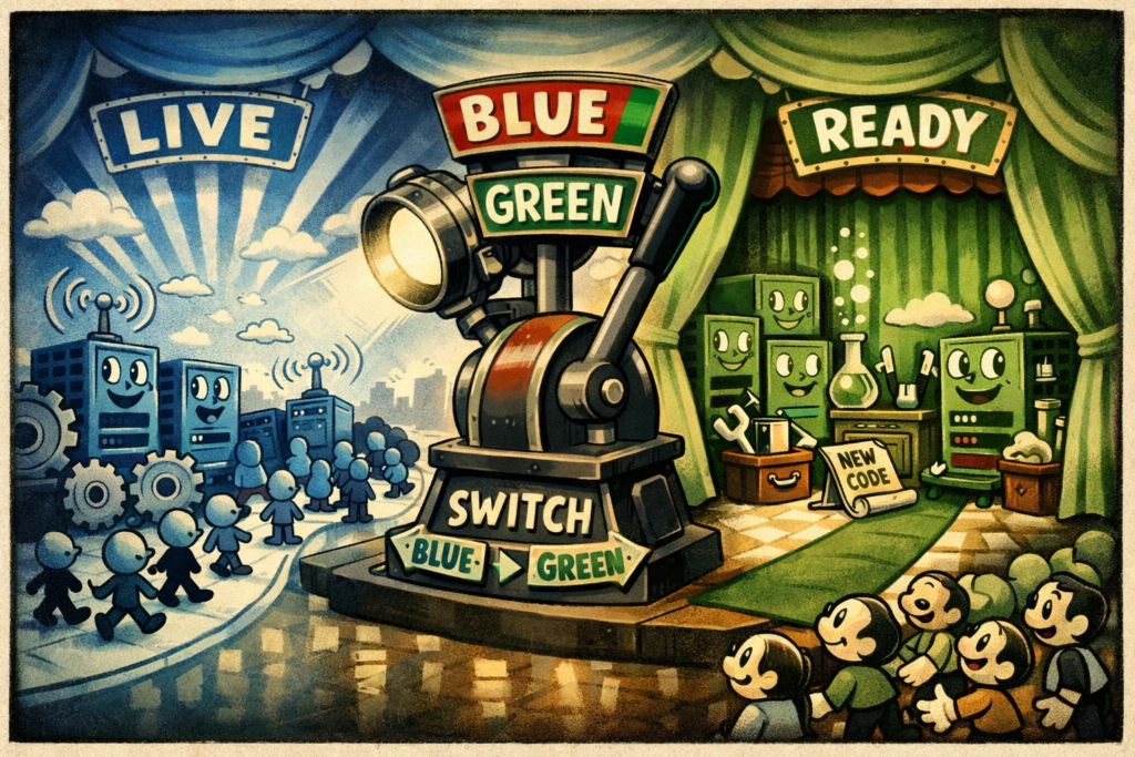 В этом и заключается главная идея подхода. Команда не обновляет рабочее окружение “по месту”, а сначала поднимает отдельную новую среду, проверяет её и только потом переводит на неё трафик. Старая версия при этом не исчезает сразу и может оставаться готовой к откату.