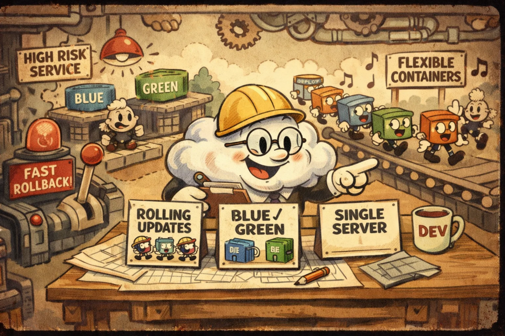 Именно поэтому Rolling Update кажется проще не во всех сценариях, а прежде всего там, где сама архитектура приложения допускает постепенную замену инстансов без резкого переключения всей среды.