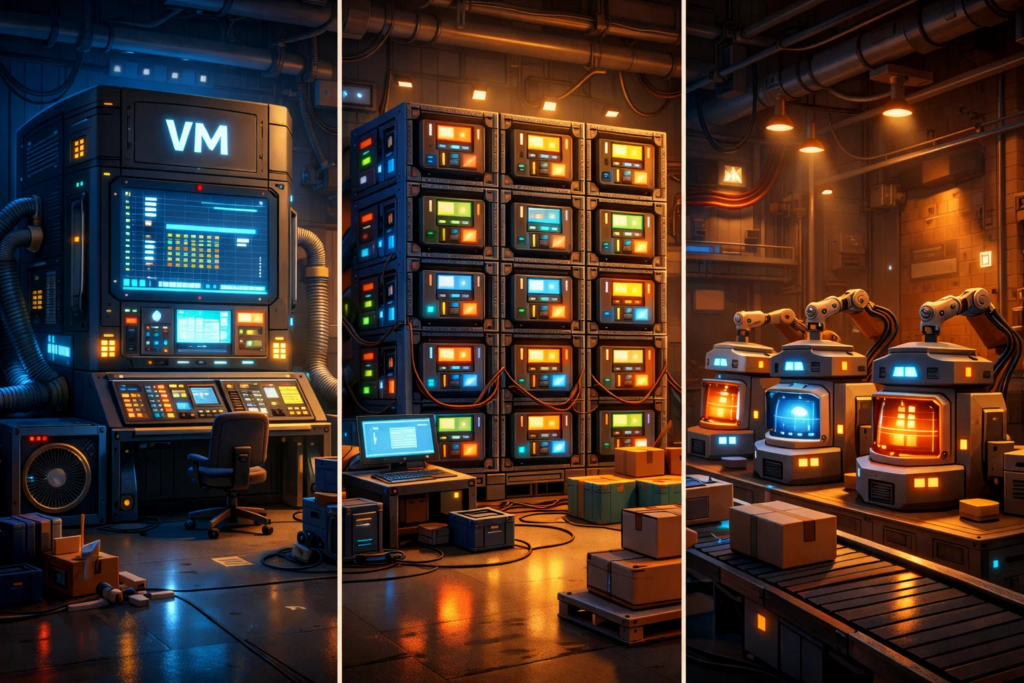Чтобы снизить порог вхождения, начнём с короткой “истории эволюции”. Когда-то всё было просто: чтобы работал сайт или приложение, нужен был физический сервер — реальное железо в стойке, которое кто-то покупал, подключал, обслуживал и берег как зеницу ока. Один сервер — одна среда. Если проект рос, приходилось докупать железо, переносить данные, переживать миграции и просто надеяться, что пик нагрузки не случится в самый неудобный момент.