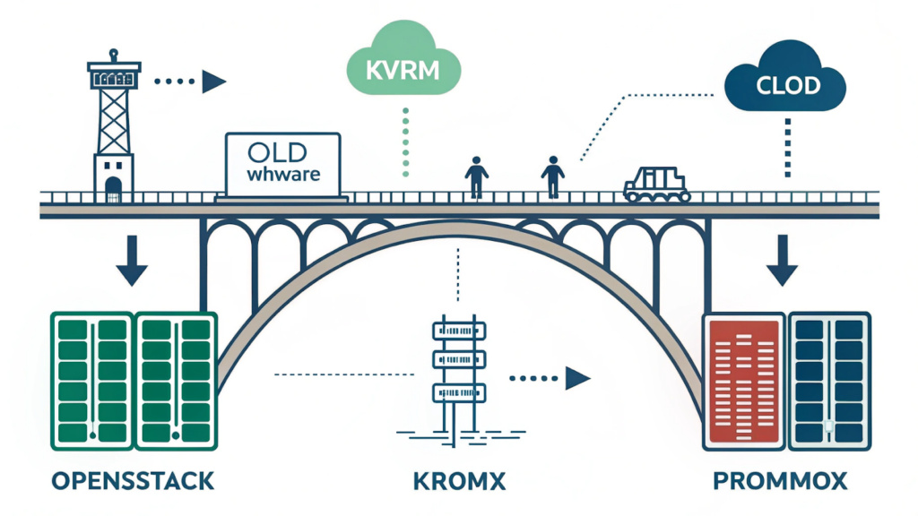 Классический сценарий — lift-and-shift. Суть проста: виртуальные машины «как есть» переносятся в OpenStack или KVM, меняется только гипервизор.