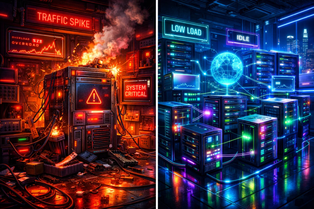Представим онлайн-магазин коллекционных фигурок. В обычные дни трафик умеренный, но во время дропа новой серии, крупной распродажи или выхода трейлера по популярной франшизе посещаемость резко взлетает. Если держать инфраструктуру под такой пик постоянно, серверы будут простаивать значительную часть времени. Если же оставить только базовую ёмкость, в момент всплеска сайт начнёт задыхаться.