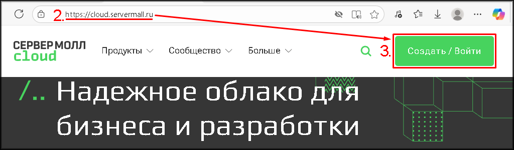 - Нажмите на кнопку “Создать / Войти”, расположенную в правом верхнем углу главной страницы сайта Сервер Молл Cloud.