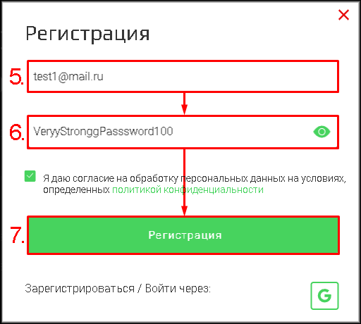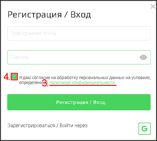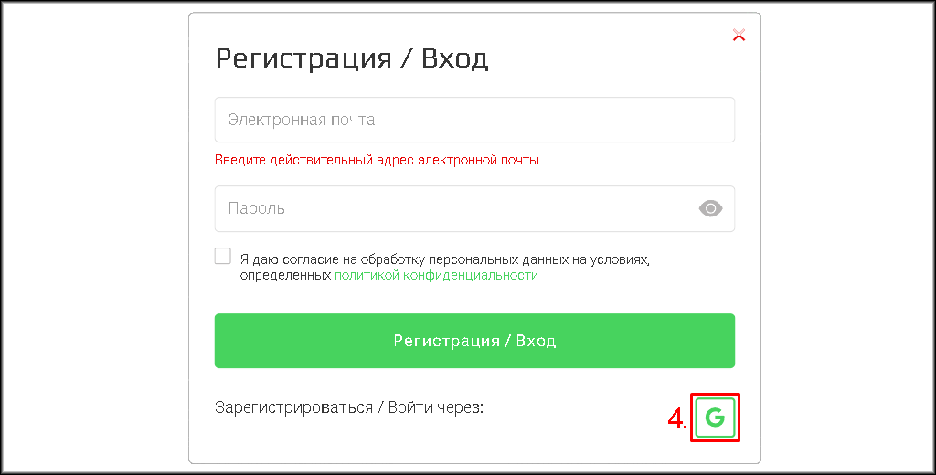 Откроется окно “Регистрация / Вход”. - Нажмите кнопку “G”.