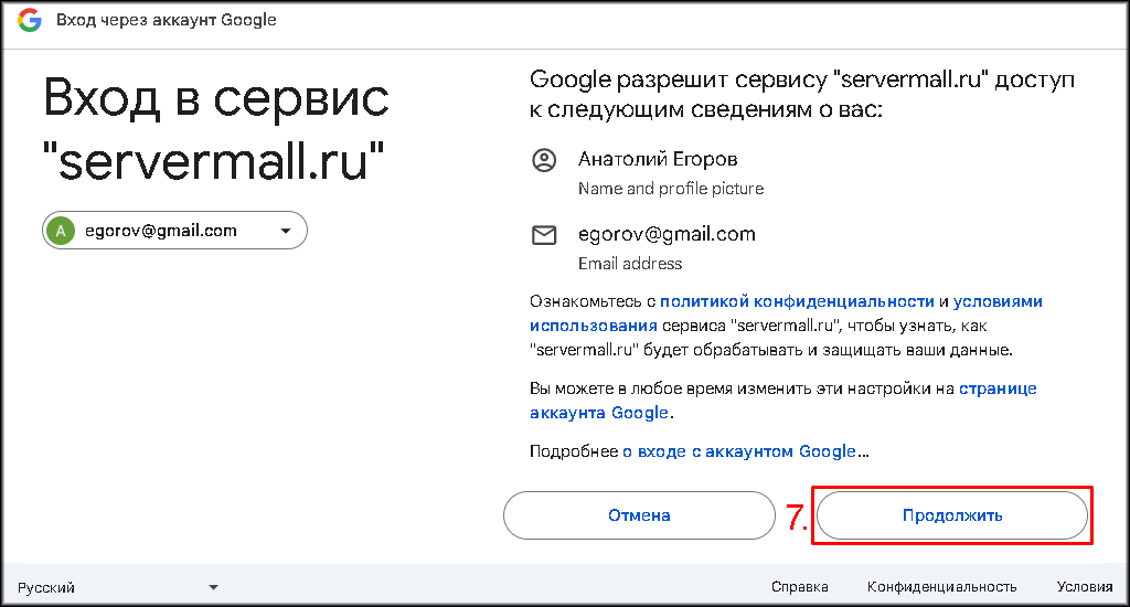 Аккаунт Google будет выбран для привязки к создаваемому аккаунту Сервер Молл Cloud и откроется окно подтверждения привязки аккаунта. - Нажмите кнопку “Продолжить”, чтобы подтвердить своё намерение привязать аккаунт Google к учётной записи Сервер Молл Cloud.