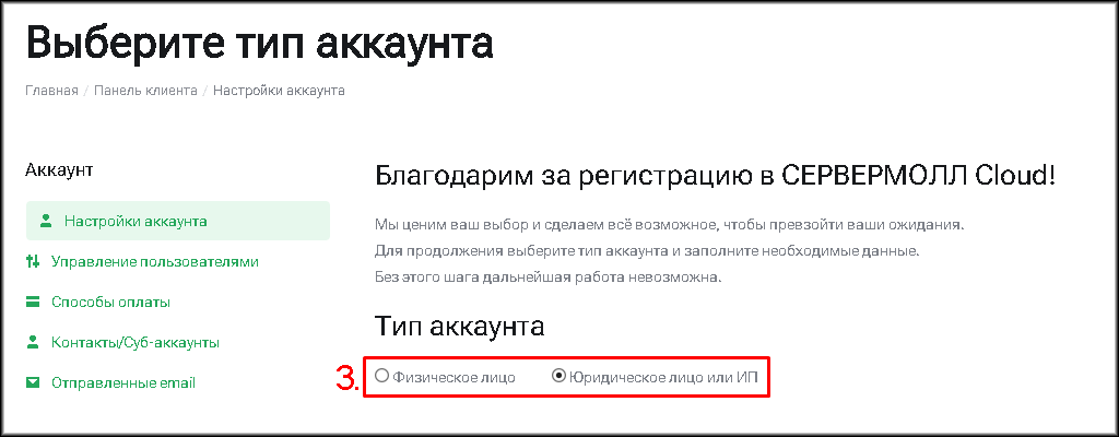 - “Физическое лицо” – если вы планируете использовать услуги Сервер Молл Cloud для личных целей.
