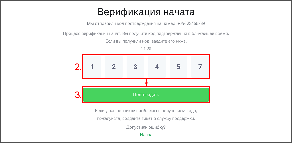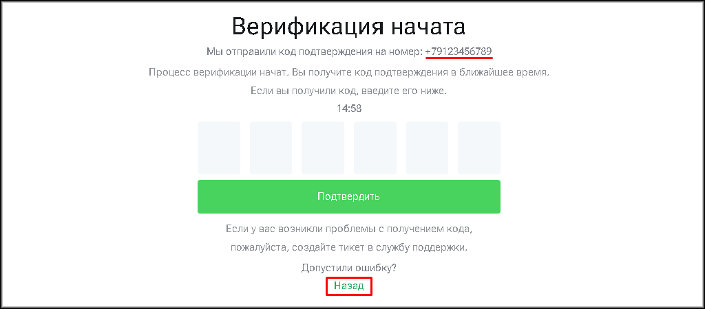Проверить номер мобильного телефона вы можете в правом верхнем углу окна “Верификация начата”. Если номер введён неверно, нажмите “Назад”.