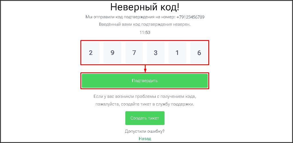 При ошибке ввода кода верификации вы будете перенаправлены на страницу “Неверный код!”. На этой странице введите код верификации повторно, убедитесь в правильности его ввода и нажмите “Подтвердить”.