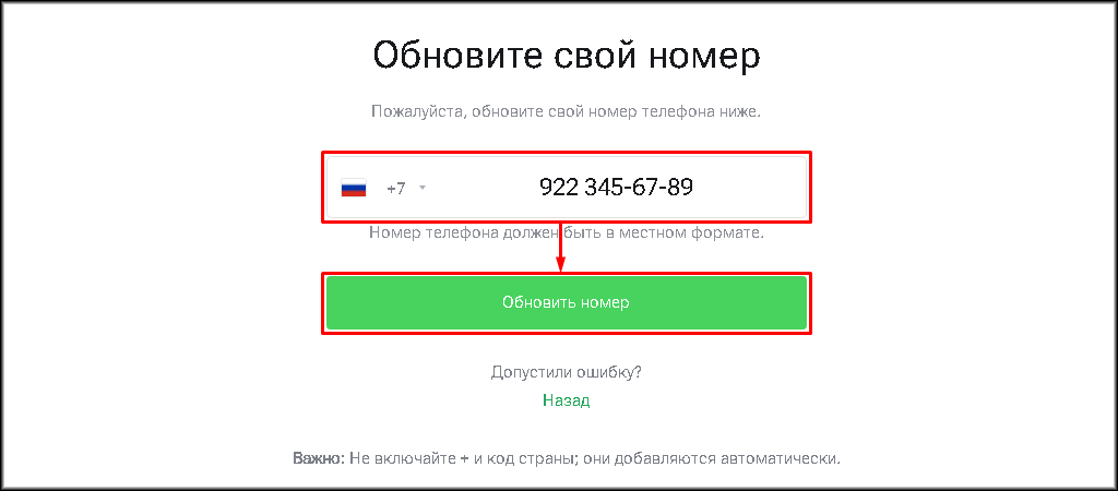 В окне “Обновите свой номер” выберите код страны, введите оставшуюся часть номера мобильного телефона и нажмите “Обновить номер”, чтобы сохранить изменения.