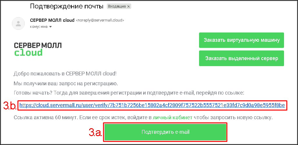 После регистрации учётной записи, независимо от выбранного способа (через Google-аккаунт или по e-mail и паролю), на указанный вами адрес электронной почты автоматически отправляется письмо от Сервер Молл Cloud с ссылкой для подтверждения. Подтверждение адреса электронной почты является обязательным этапом и необходимо для полноценного использования услуг Сервер Молл Cloud.