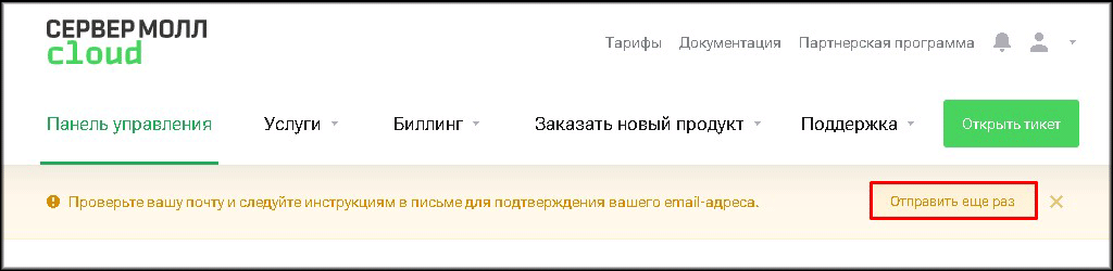 Теперь, чтобы оформить заказ на услуги и продукты Сервер Молл Cloud, вам останется лишь подтвердить адрес электронной почты, привязанной к аккаунту. Как это сделать, описано в части V настоящей инструкции.