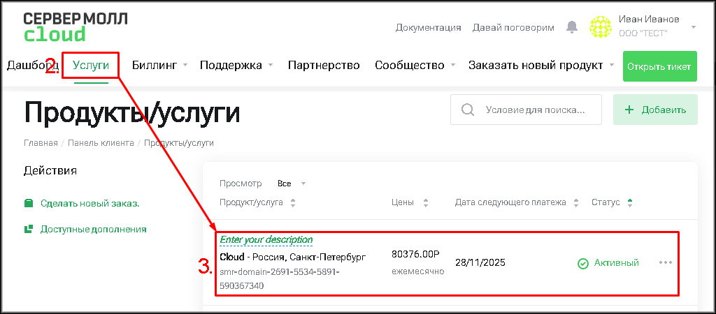 Вы попадёте на страницу «Продукты / услуги», где отображён полный список ваших услуг. - Выберите облачную инфраструктуру, для которой требуется выполнить аутентификацию.