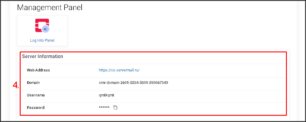 - Войдите в панель управления Сервер Молл Cloud. О том, как это сделать, смотрите в инструкциях: