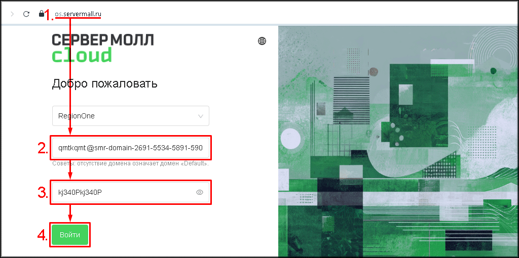 В этом разделе описано, как выполнить вход в панель управления облачной инфраструктурой Сервер Молл Cloud.