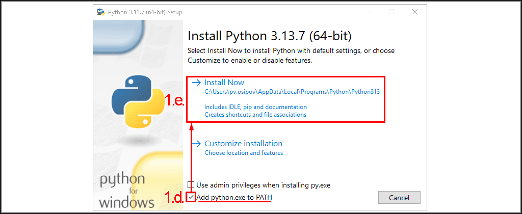 Примечание: Если вы не установите галочку «Add python.exe to PATH«, то вам нужно будет вручную добавлять путь к Python в переменные среды.