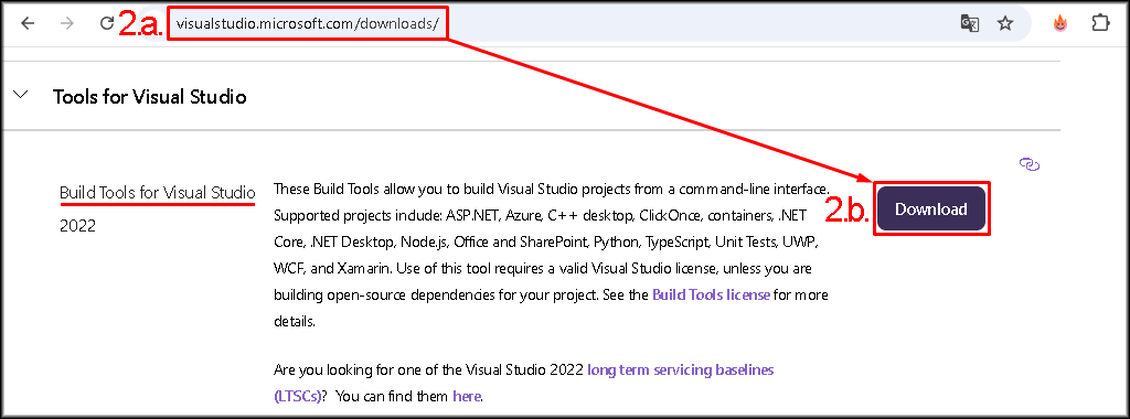 - Спуститесь вниз по странице в раздел «Tools for Visual Studio» и в карточке «Build Tools for Visual Studio 202х« нажмите кнопку «Download«.