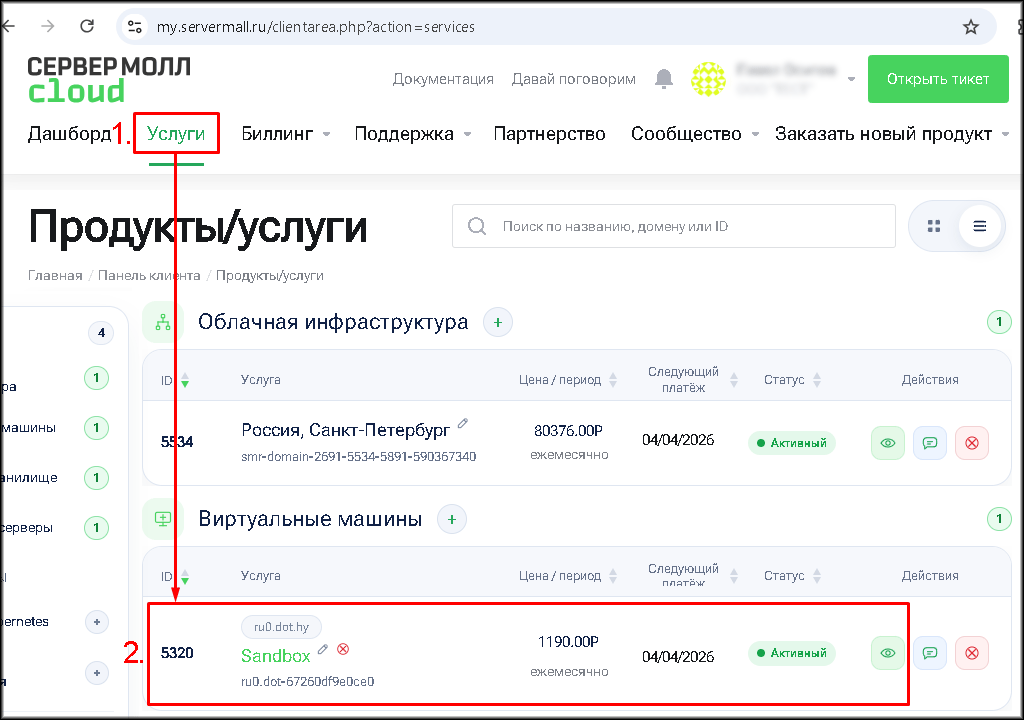 - Вы должны войти в свою учётную запись на сайте Сервер Молл Облако: