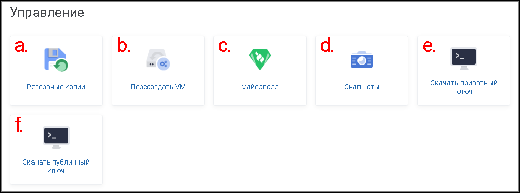 В разделе вы можете запустить менеджер резервного копирования, пересоздать виртуальную машину, выбрав образ ОС, а также скачать SSH-ключи и настроить файерволл.