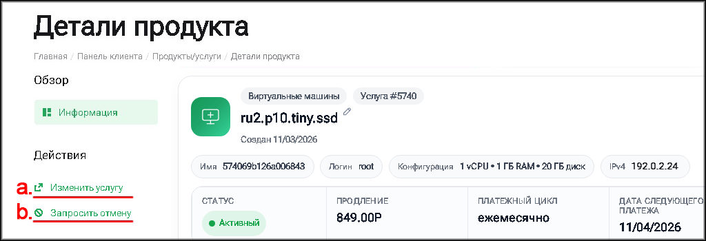 a. “Изменить услугу” – выбор новой конфигурации виртуальной машины.