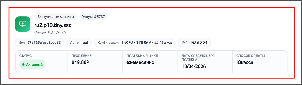 “Дата следующего платежа” – дата, до которой необходимо внести оплату за следующий платёжный период, чтобы сохранить работоспособность виртуальной машины.