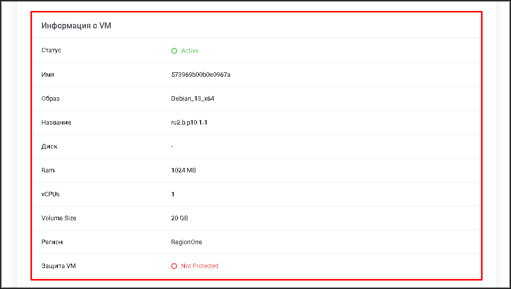 - “Rescue” – виртуальная машина запущена в режиме восстановления (rescue mode).